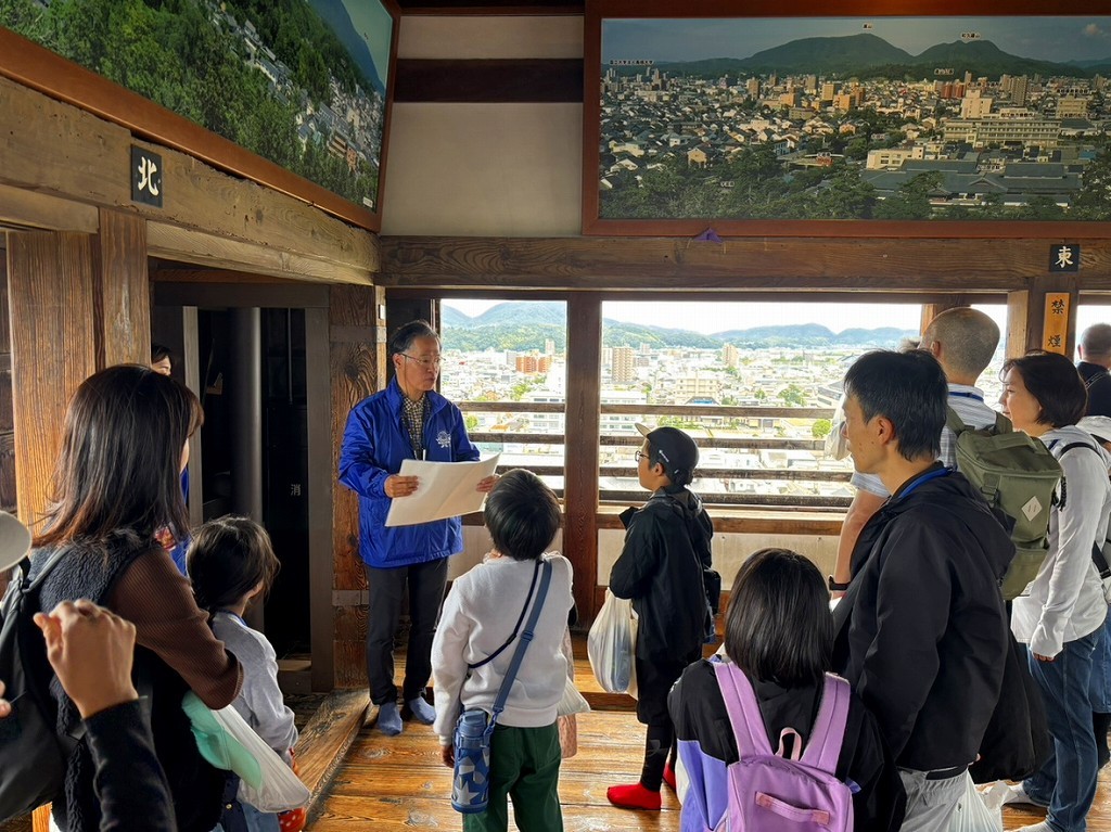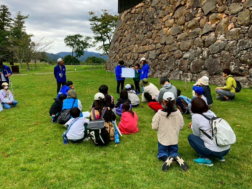今年は17組の家族が参加され、4つの班に分かれて椿谷や石垣を大学生のスタッフと巡って松江城を満喫。