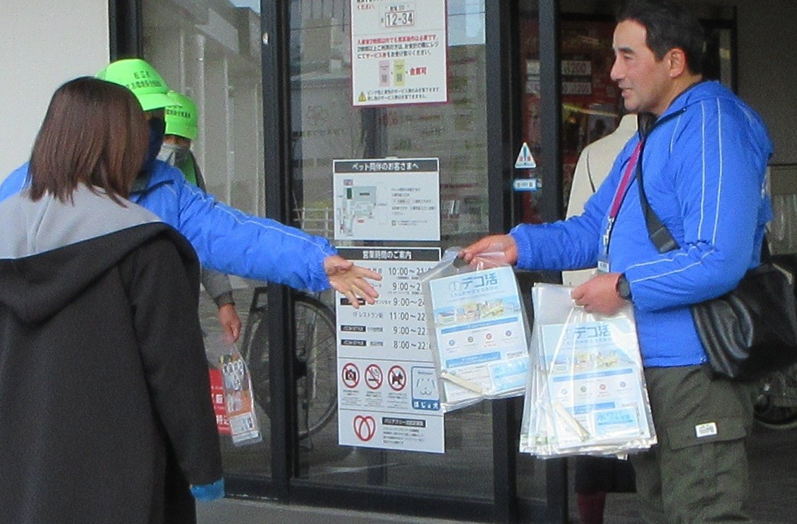 令和7年12月20日(土)、デコ活 食品ロス削減の街頭啓発活動を行いました。 イオン松江ショッピングセンターを訪れた方に、チラシと環境にやさしいグッズ等をお配りし、デコ活と食品ロス削減を呼び掛けました。 参加者みんなで力を合わせた結果、短い時間でしたがたくさんの方に啓発することができました。啓発活動にご協力いただいた皆様、ありがとうございました。