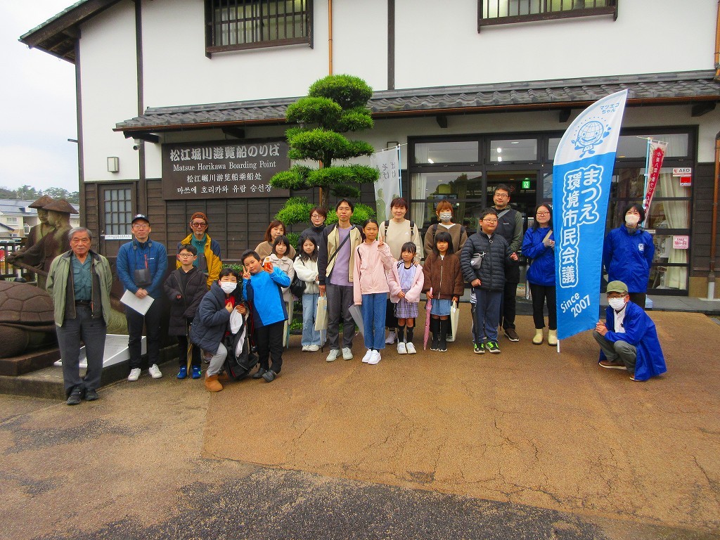 事前にお申し込みされた小学生親子8組が、電動船で豆炭こたつを備えた冬場仕様の「こたつ船」に乗って、松江城のお堀を巡りながら講師から生き物や自然環境のお話を聞きました。