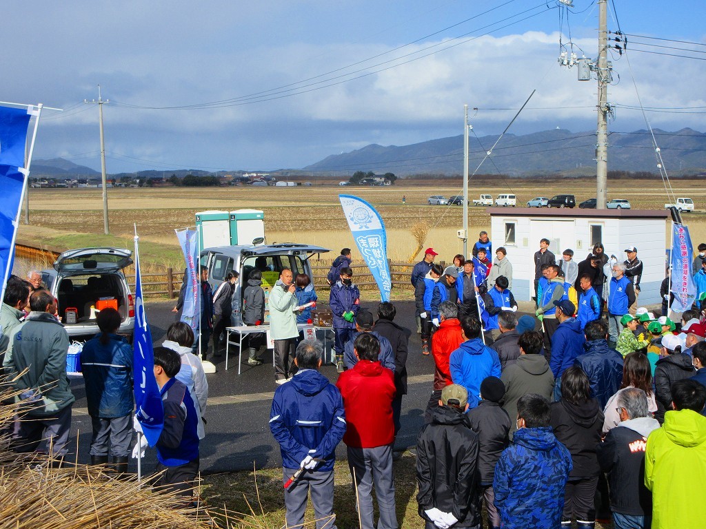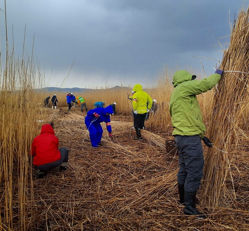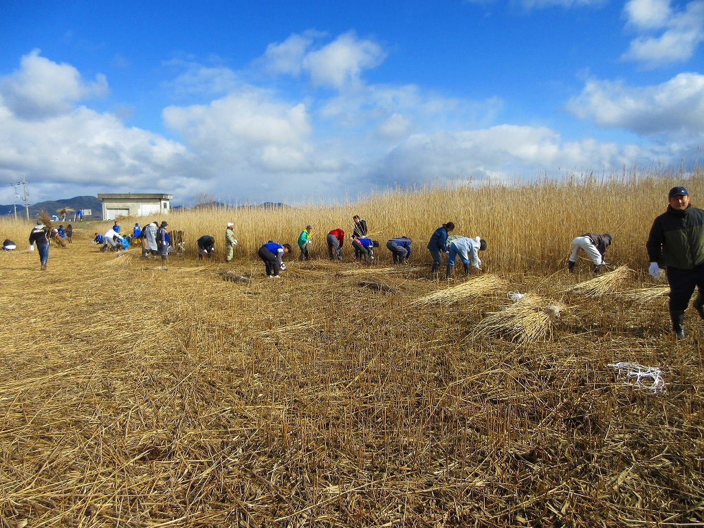 今年の両作業日は気温が低く、天気にもあまり恵まれませんでしたが、参加者は朝から宍道湖西岸なぎさ公園に集合し、たくさんのヨシを刈って集積しました。